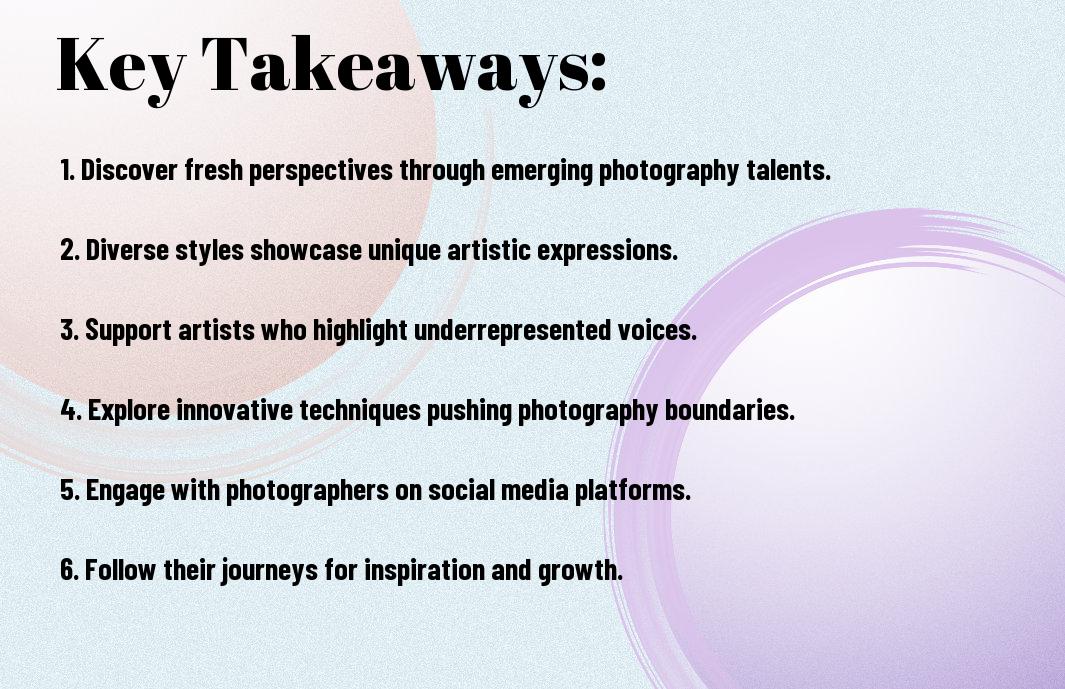 With the ever-evolving world of photography, discovering fresh talent can enhance your own visual journey. In this list, we highlight 10 up and coming photographers whose unique perspectives and innovative techniques are making waves in the industry. By following their work, you can gain inspiration and insight into new styles and trends that may resonate with your own photography. Get ready to explore a diverse range of captivating images that reflect creativity and passion, inviting you to see the world through their lens.