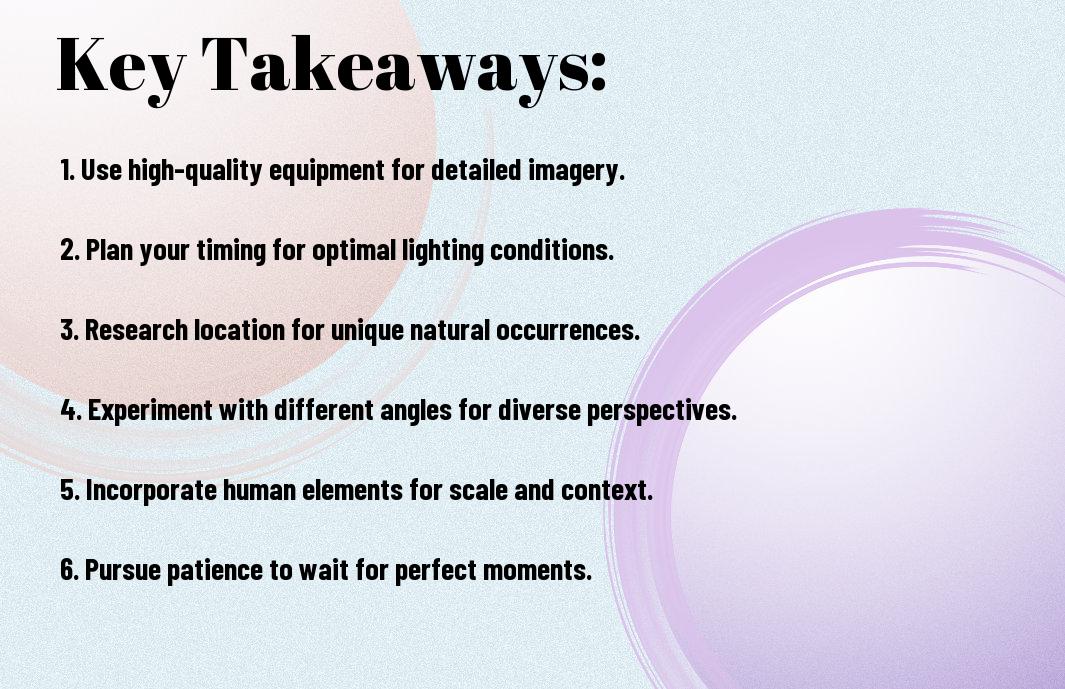 Despite the challenges posed by rare natural phenomena, mastering several techniques can help you capture their unique beauty. Focusing on your equipment and settings is imperative to bringing out the luminous qualities of these events. Whether you’re using a camera, drone, or smartphone, understanding composition, lighting, and timing will make all the difference in your results.