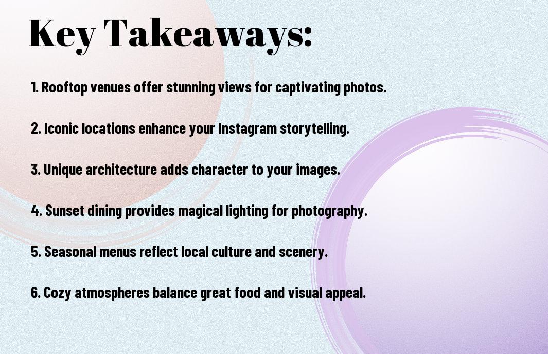 As a reminder, when seeking elevated restaurants that enhance your Instagram feed, consider those with stunning views, unique architecture, and delectable cuisine. Locations like rooftop bars and hilltop dining spots provide not only breathtaking panoramas but also a cozy atmosphere for enjoying meals. By choosing the right venue, you can elevate both your dining experience and your social media presence, ensuring that your followers are captivated by your culinary adventures. Whether it’s a sunset skyline or a picturesque landscape, the right backdrop can make all the difference for your posts.