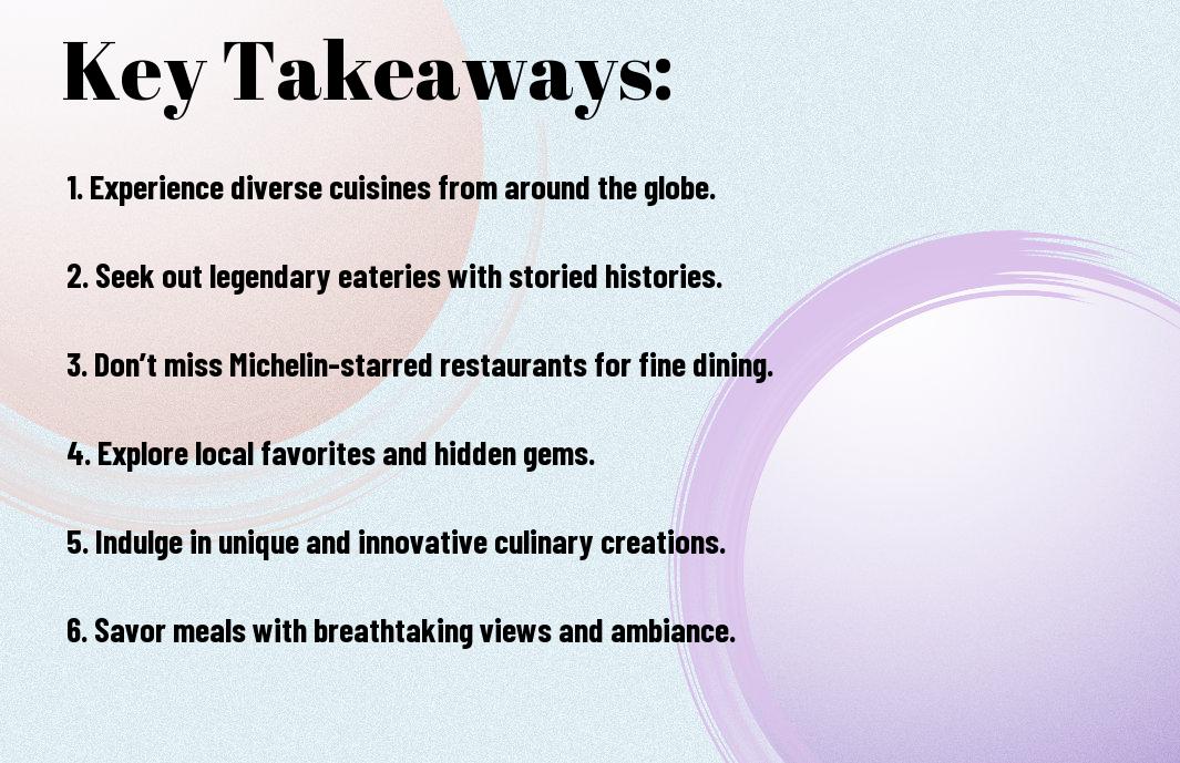Presently, if you consider yourself a true foodie, compiling a bucket list of must-visit restaurants around the world is imperative for an unforgettable culinary journey. Each dining experience offers unique flavors, cultures, and stories that enhance your appreciation for diverse cuisines. You should venture beyond your local favorites and explore iconic establishments that will leave lasting memories. Ticking these restaurants off your list not only enriches your palate but also allows you to connect with fellow food enthusiasts who share your passion for gastronomic adventures.