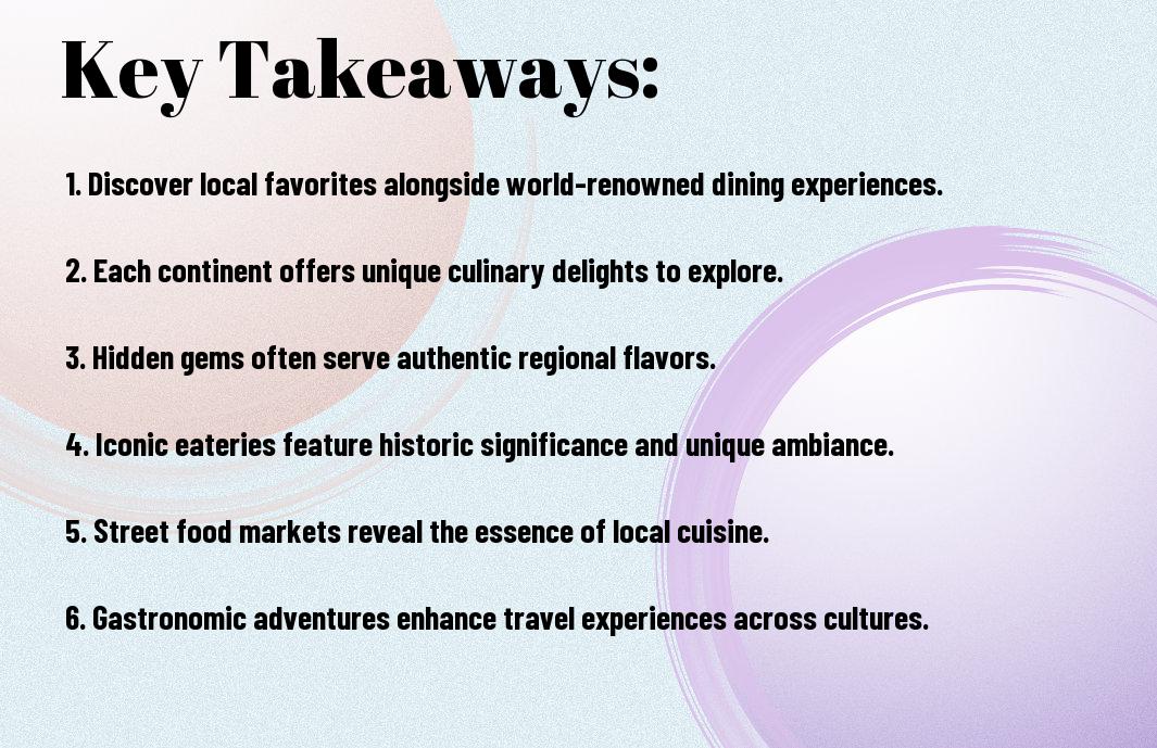So, as you launch on your culinary adventures around the globe, exploring these hidden gems and iconic eateries will surely elevate your dining experience. Each continent offers a unique taste of local culture, flavors, and traditions that are waiting for you to discover. By sampling dishes from these standout restaurants, you enrich not just your palate but also your understanding of the world. Bon appétit on your journey through the best that global cuisine has to offer!