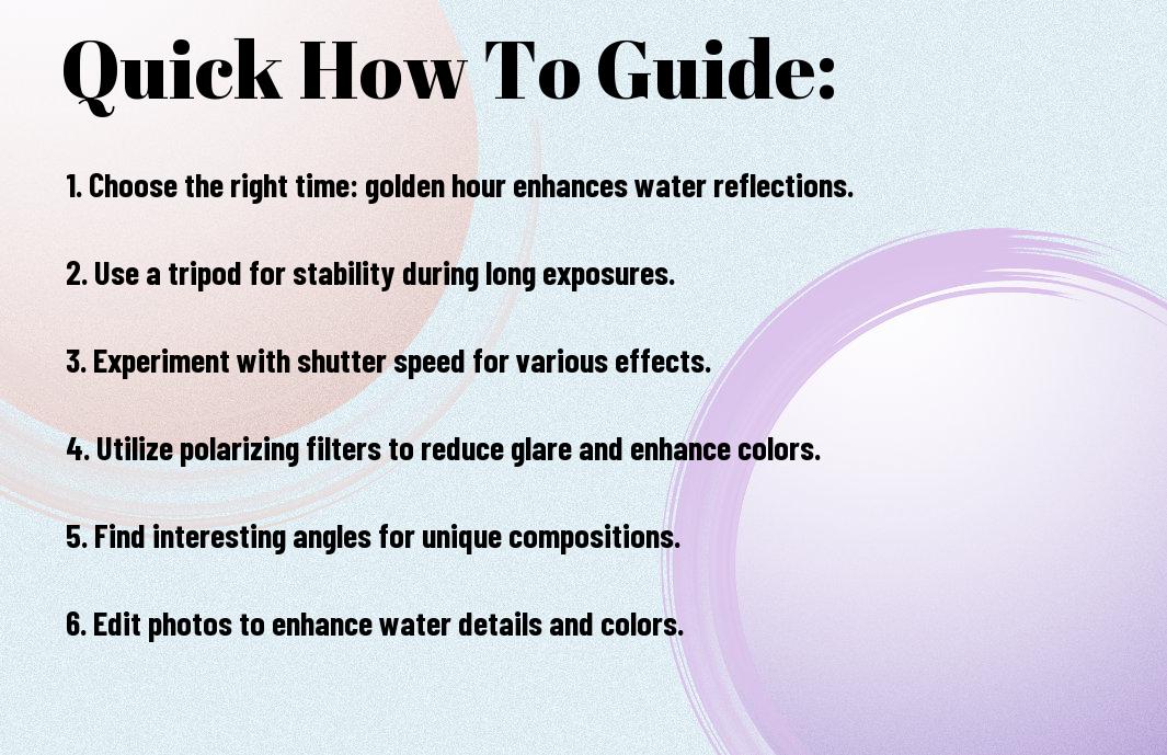 Presently, mastering the elements of water photography means understanding your environment and optimizing your techniques for each scenario. Whether you’re shooting tranquil lakes or roaring oceans, adapting your settings, composition, and timing can transform your images. You should explore various lighting conditions, use the right gear, and experiment with different angles to capture the unique beauty of water in all its forms. By applying these strategies, you can elevate your skills and create fantastic water photos that resonate with your audience.