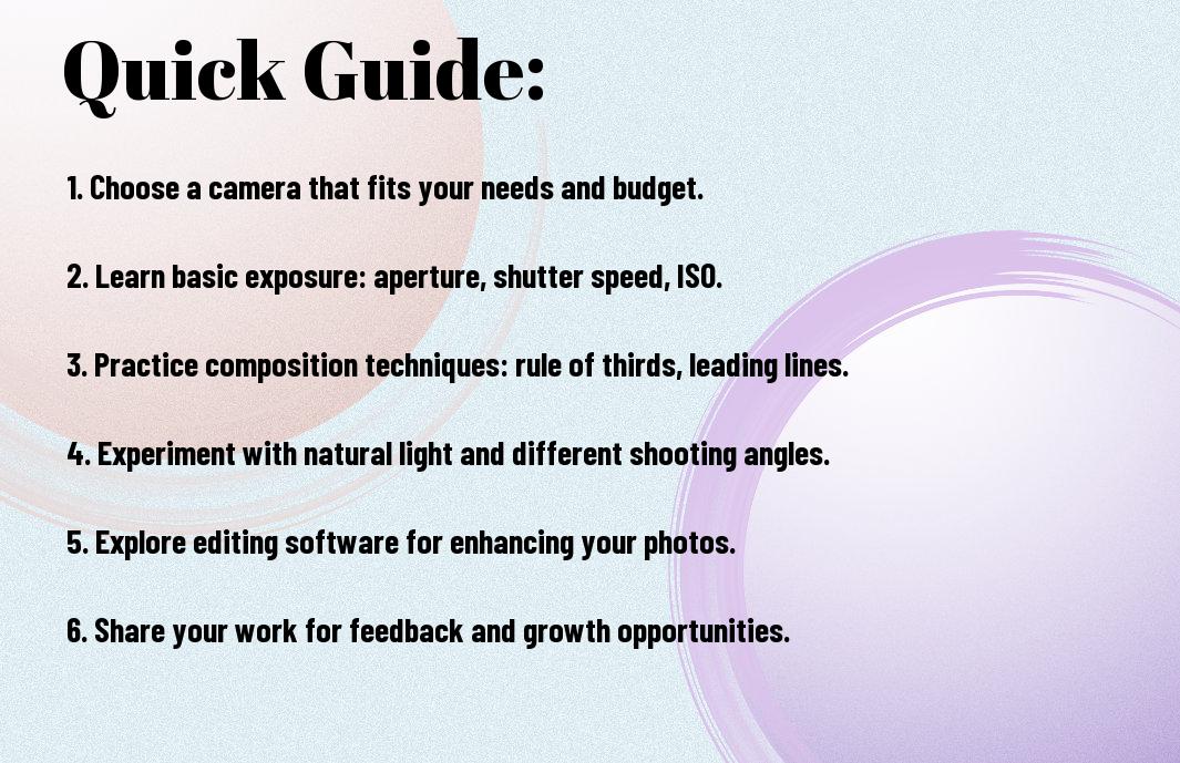 Photography is an exciting and rewarding journey that allows you to capture the beauty and intricacies of the world around you. In this comprehensive guide, you will discover crucial tips and techniques that will help you develop your skills and confidence as you initiate on your photography adventure. From understanding your camera settings to mastering composition and lighting, each tip is designed to enhance your creativity and improve your shots. Get ready to explore the art of photography and transform your passion into stunning visual storytelling!