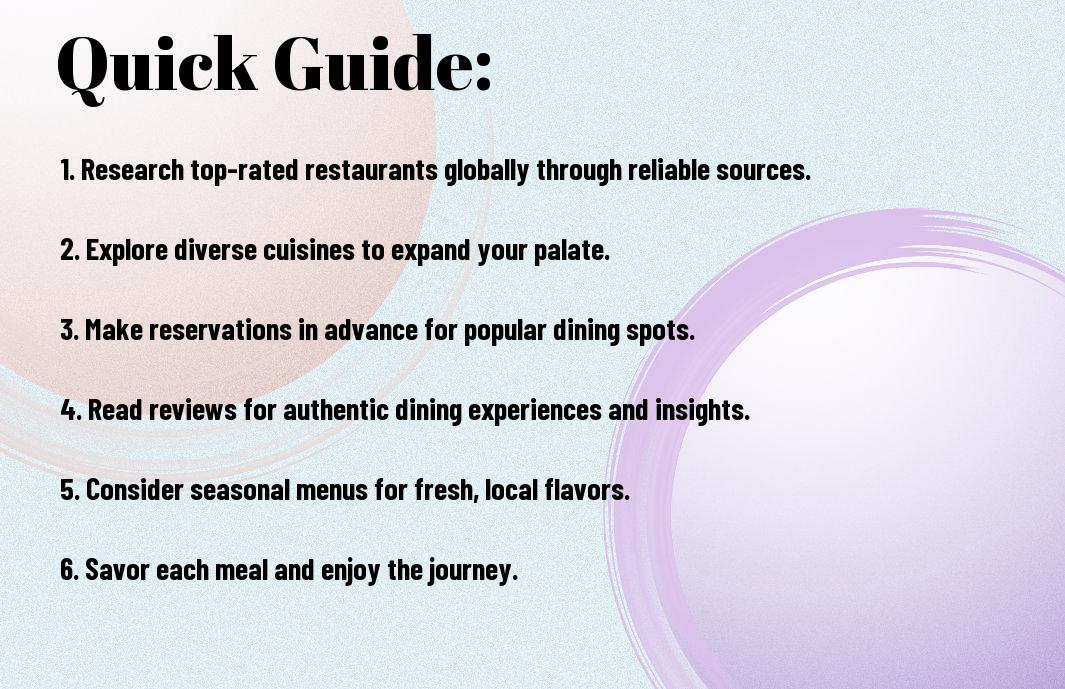 Restaurants offer more than just meals; they provide unforgettable experiences that tantalize your taste buds and expand your culinary horizons. In this ultimate guide, you will explore the best dining establishments around the globe, from cozy hidden gems to lavish Michelin-starred venues. Each selection is curated to enhance your culinary journey, helping you discover diverse flavors and innovative dishes that define global gastronomy. Join us as you commence on this flavorful adventure, designed to elevate your dining experiences to new heights.