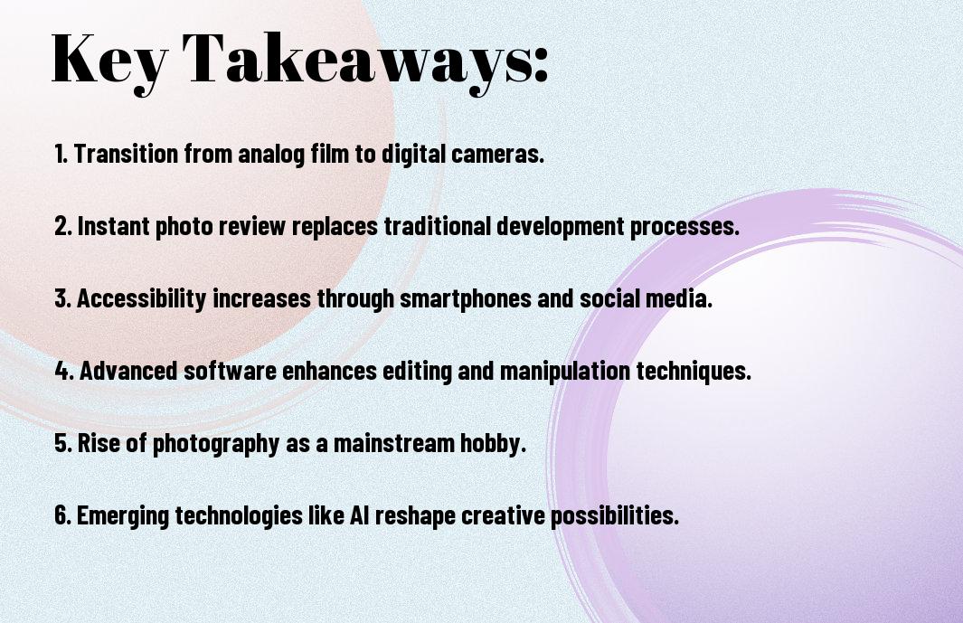 Conclusively, your understanding of photography’s evolution from film to digital and beyond highlights a remarkable journey characterized by technological advancements and increased accessibility. As you explore these shifts, you can appreciate how each innovation has transformed the way you capture and share moments. Embracing these changes not only enhances your skills but also enriches your creative expression, empowering you to tell stories through your lens in ways that were once unimaginable.