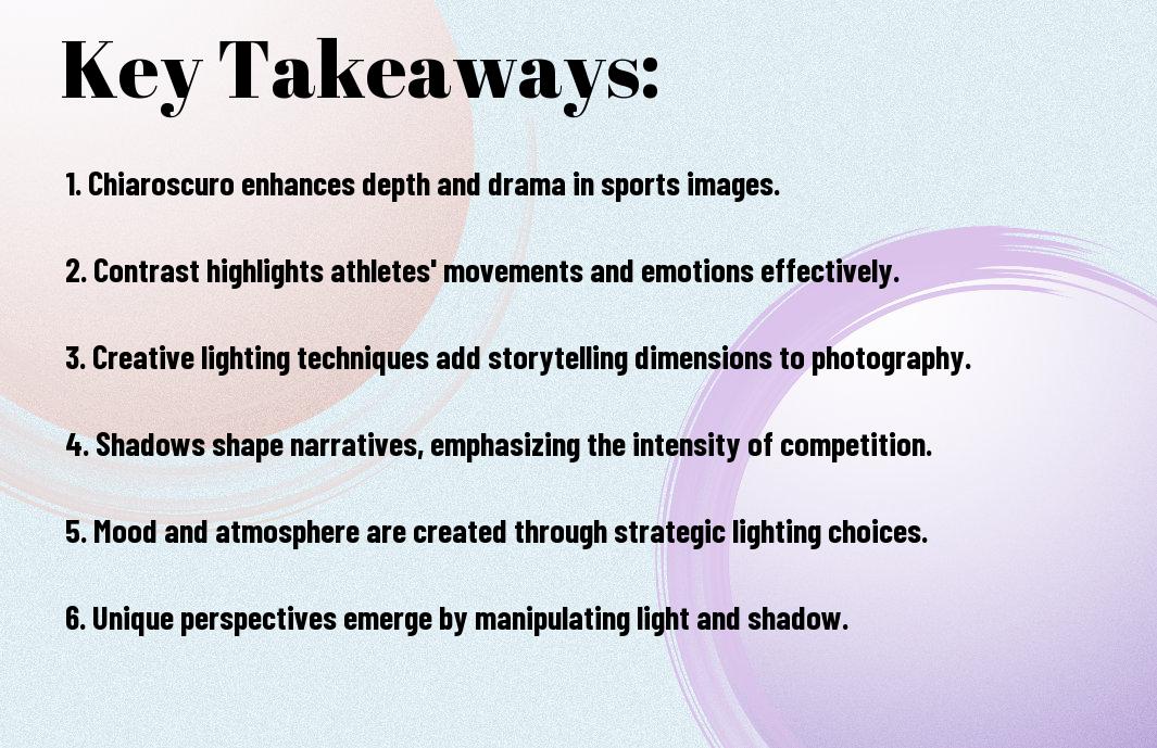 About utilizing chiaroscuro, you can bring a three-dimensional quality to your sports images. By strategically using light and shadows, you can sculpt the athletes and their surroundings, making them pop off the frame. This technique not only enhances the visual appeal but also guides the viewer’s eye, empowering you to convey a more dynamic narrative.